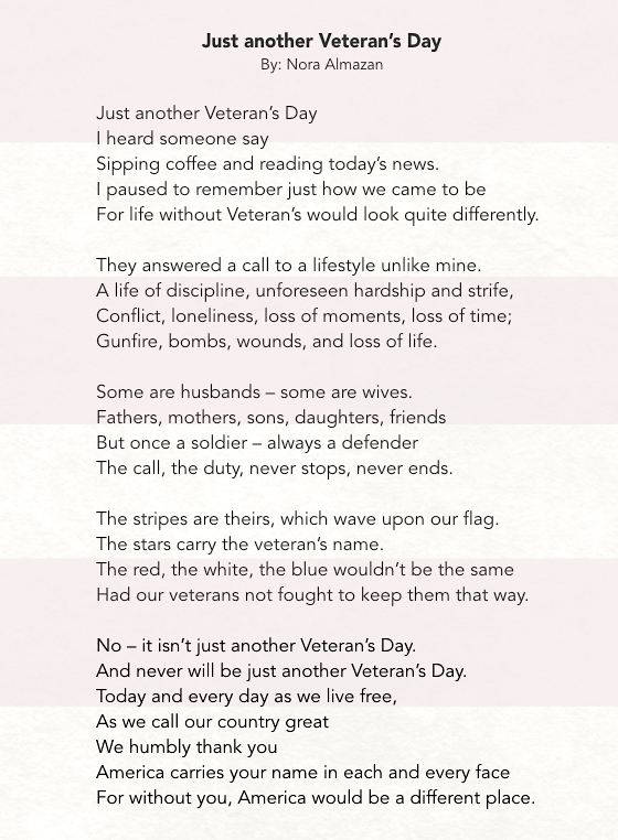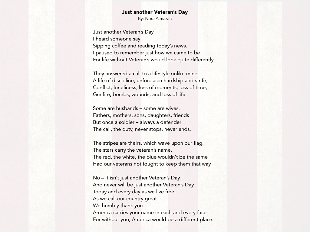 Just Another Veteran’s Day By Nora Almazan - November 10, 2016 FacebookTwitterEmailPrint A tribute to our nation’s veterans Print Article