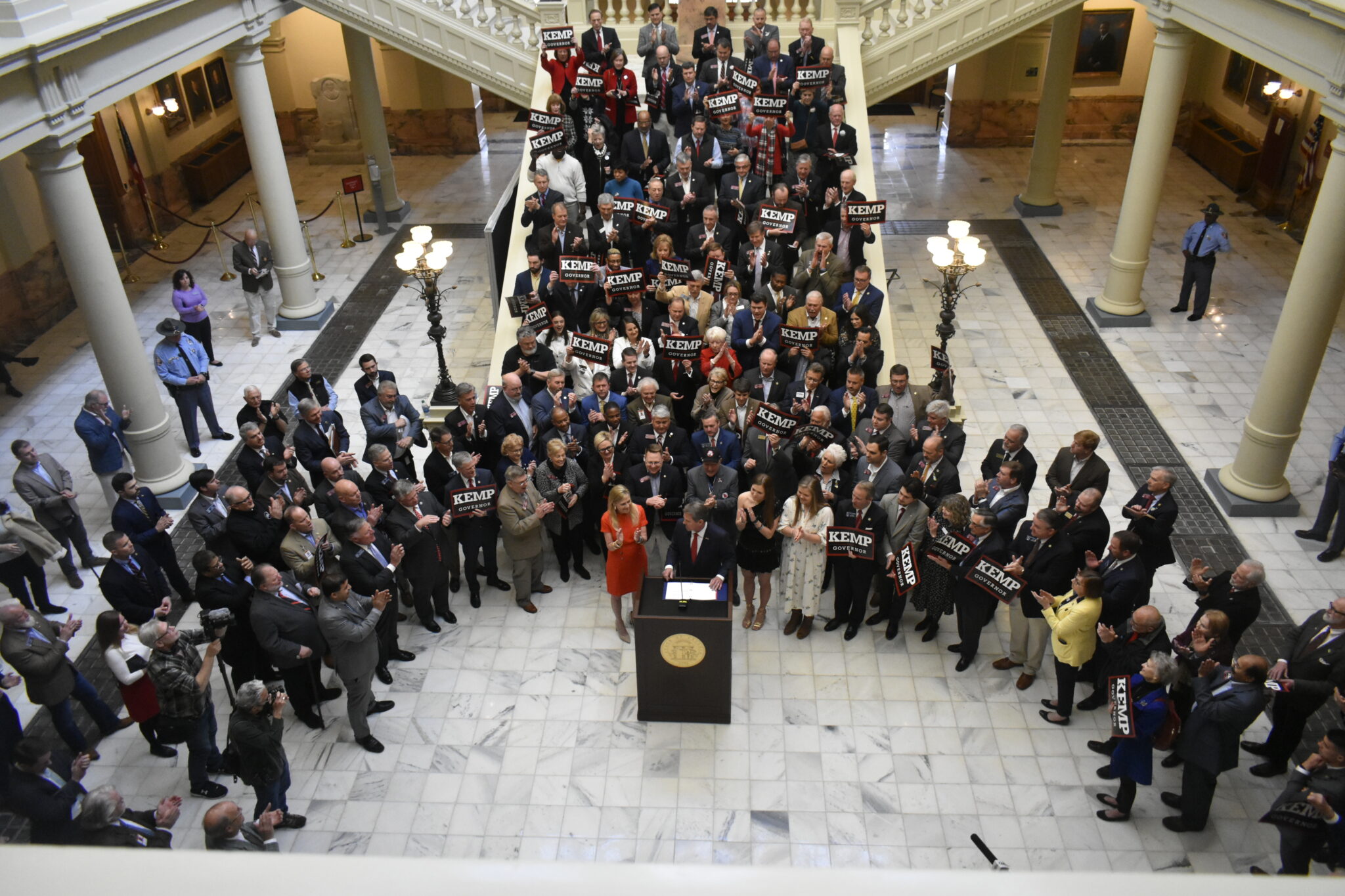 Gov. Brian Kemp officially kicked off his bid for a second term Thursday with a large group of lawmakers and supporters backing his campaign.