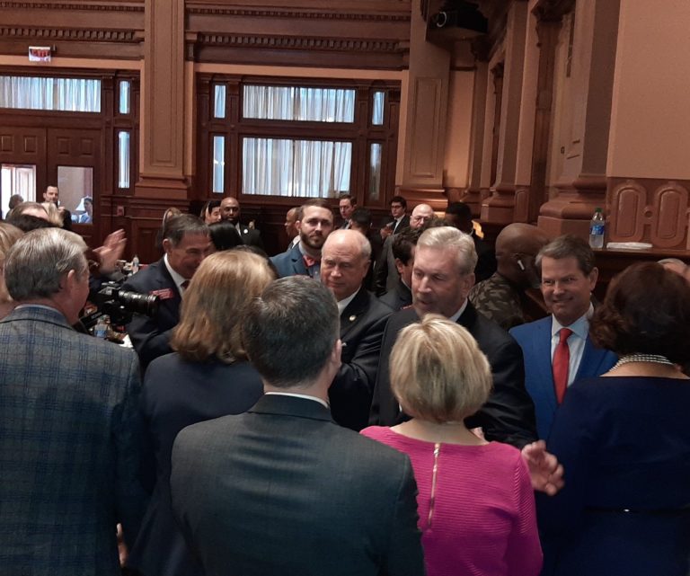Rep. Terry Rogers (R-Clarkesville) enters the House Chamber with Gov. Kemp (far right, in red tie) before the governor’s State of the State speech on Jan. 16, 2020. (Photo: Georgia Recorder)