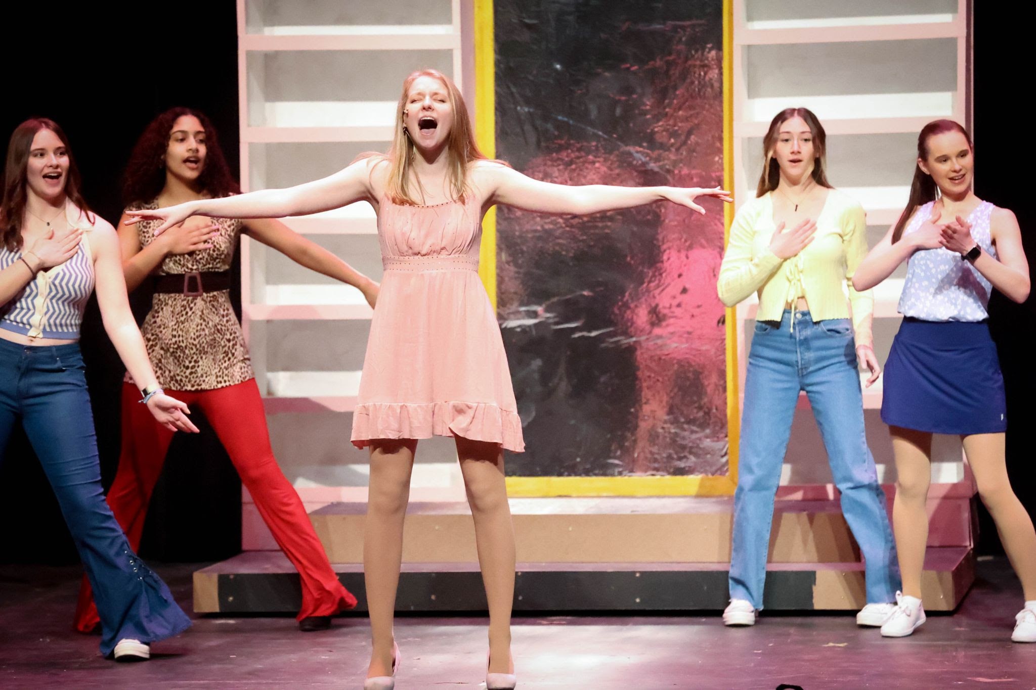 Lucy Barry of Tiger, GA, performs as Elle Woods in “Legally Blonde The Musical.” Pictured, in back from left, are ensemble members Larissa Orr of Franklin, Angela Cordero of Kissimmee, FL, Norah Fillman of Tiger, GA, and Sarah Katherine Brenner of Franklin, NC. The show runs February 10-12 in the Rearden Theater at Rabun Gap-Nacoochee School.