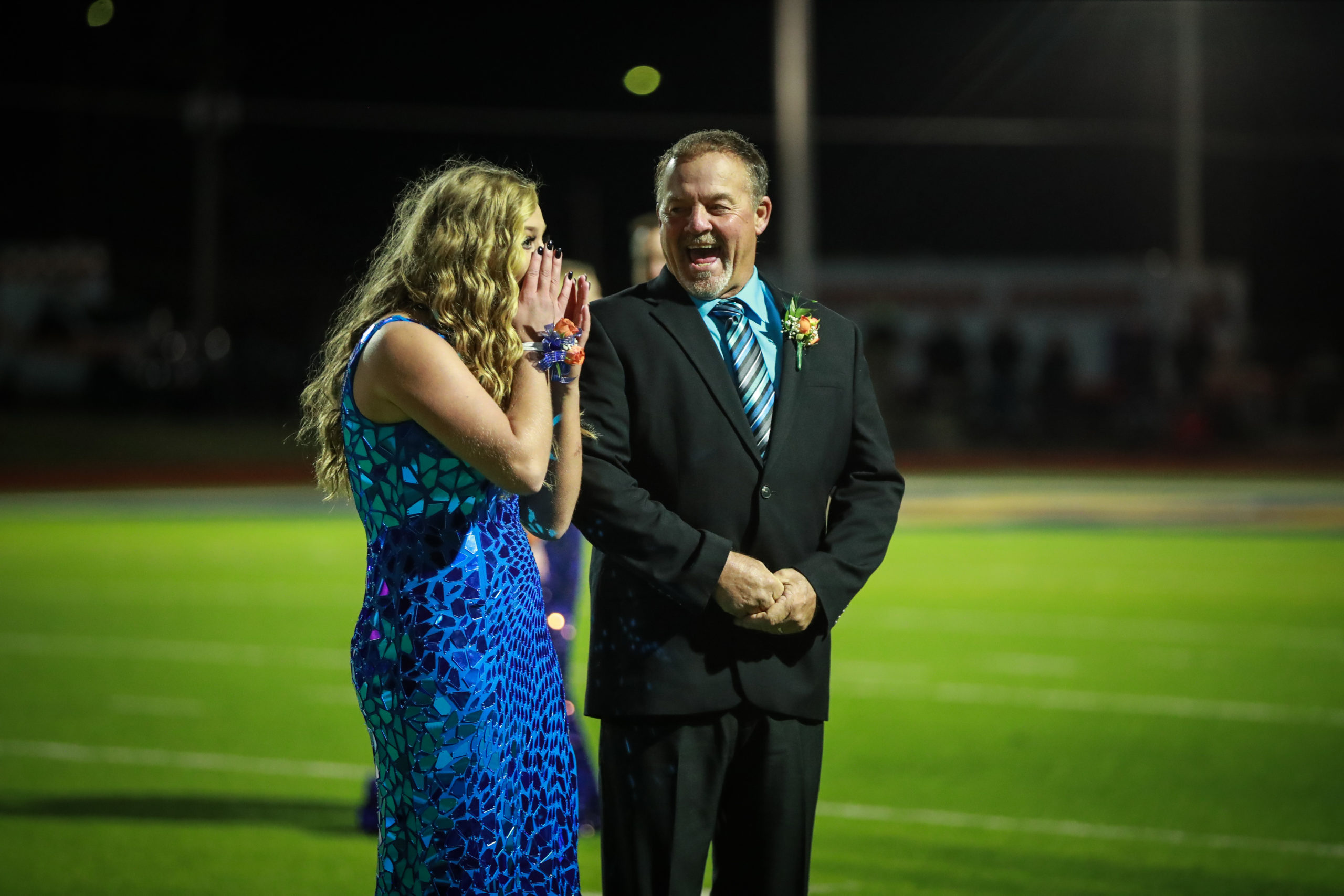 Hix’s father escorted her onto the field where they stood along with the rest of the Homecoming Court waiting for the announcement during halftime. Wade’s mother brought a stand-in for her son who’s a defensive end on the Raider football team.