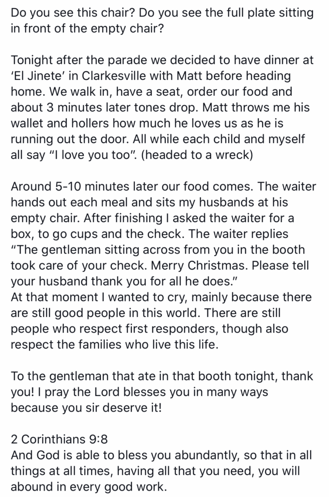 In her post, April tells how their family decided to stop for dinner in Clarkesville after attending the Habersham County Christmas Parade on December 14 in Baldwin. They had just settled in to enjoy their meal together when her husband was suddenly called away to a wreck.