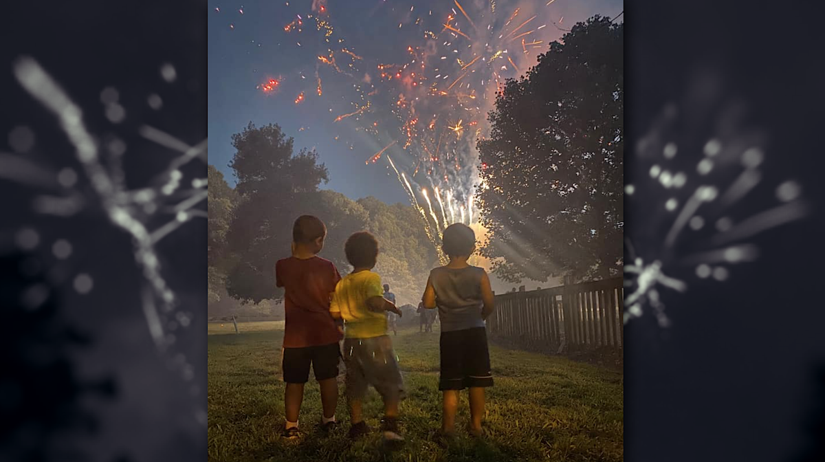 Three young friends watch in awe as fireworks explode over Pitts Park.