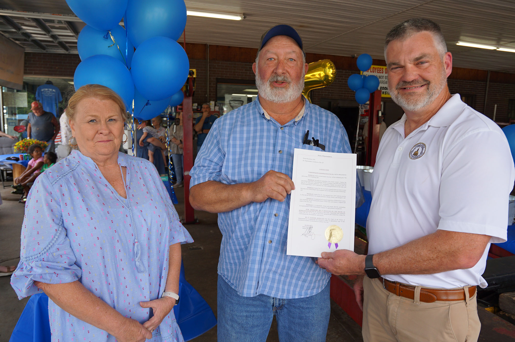 State Rep. Victor Anderson, right, presents a House passed proclamation to Sutton Tire owners Jeanene and Clark Sutton during the businesses 75th anniversary on Friday, June 10, 2022. (Jenna Williamson/Now Habersham)