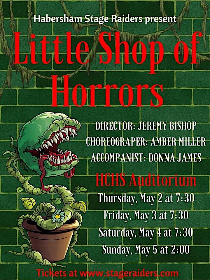 The Habersham Stage Raiders’ production of Little Shop of Horrors opens Thursday, May 2. Performances are at 7:30 p.m. May 2-4 and at 2 p.m. on Sunday, May 5. All performances are in the Habersham Central High School Auditorium located at 2059 Highway 197 South in Mt. Airy.