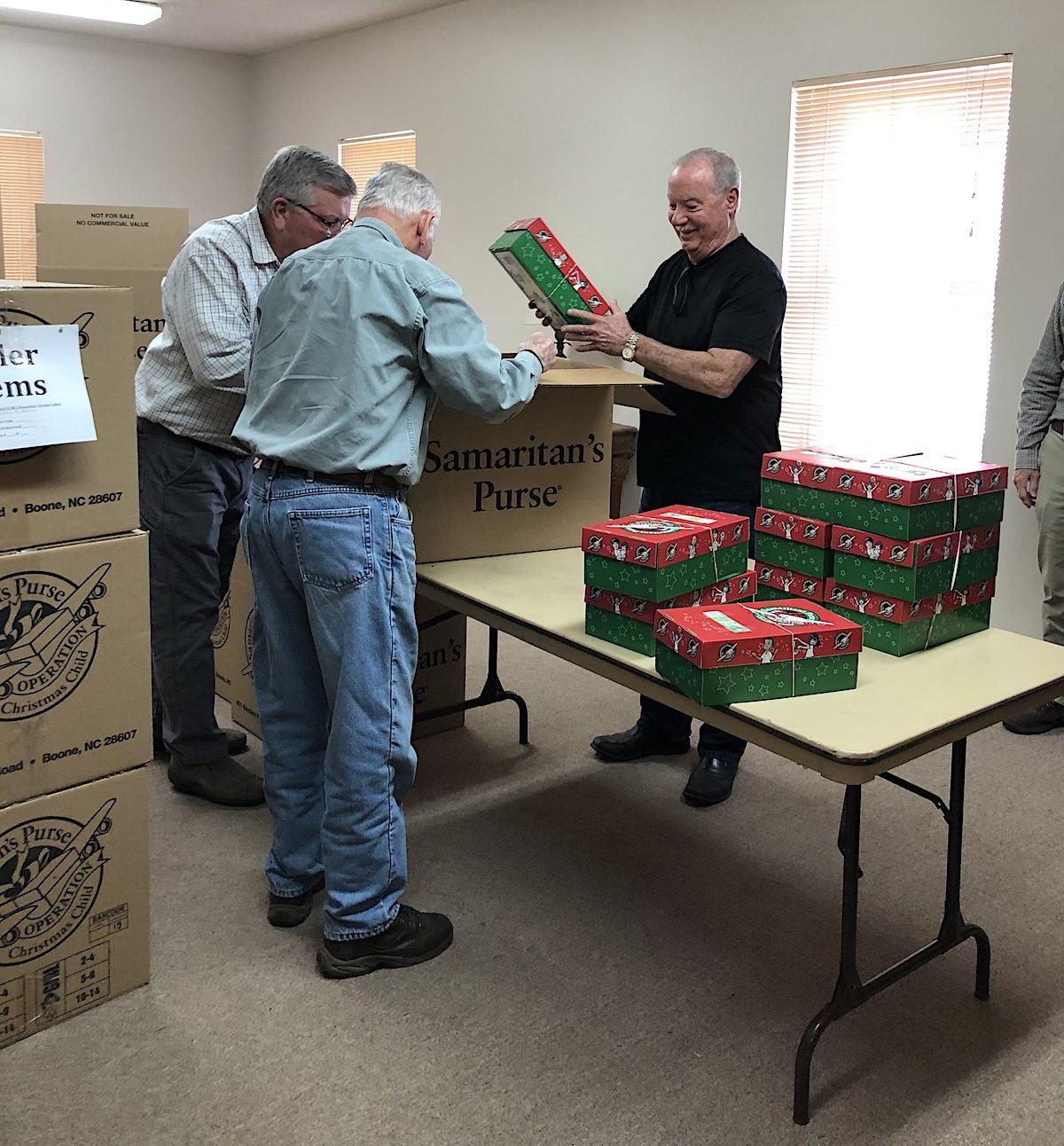 Bethlehem Baptist was OCC’s central drop-off point for four counties this year. Volunteers from Habersham, Rabun, Stephens, and White counties contributed. Carley Abner was the drop-off leader. He coordinated teams of volunteers to receive the shoeboxes from churches and individuals and pack them into shipping boxes for transport.