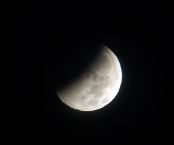 It was a battle against the clouds and terrible atmospheric conditions this morning in Dahlonega, but I was able to get some pics of the lunar eclipse. This made the first visible eclipse across any part of the region since 2010. The next eclipse will occur in September and we can always hope for better conditions. The pics below were captured through a 6″‘ Dobsonian telescope. Notice the “shimmer” across the disk, this was caused by strong winds in the mid/upper atmosphere which makes focusing difficult, but also results in the moon seeming to “twinkle” especially around the edges.