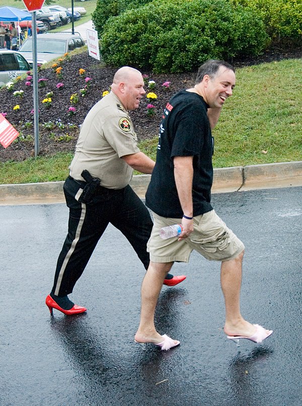 Here’s the potentially harmful mix. Take a six-foot tall, 200-pound man and his size-13 feet and squeeze them into a pair of women’s pumps. Then, watch and try not to laugh as he walks a mile through the streets of your hometown.