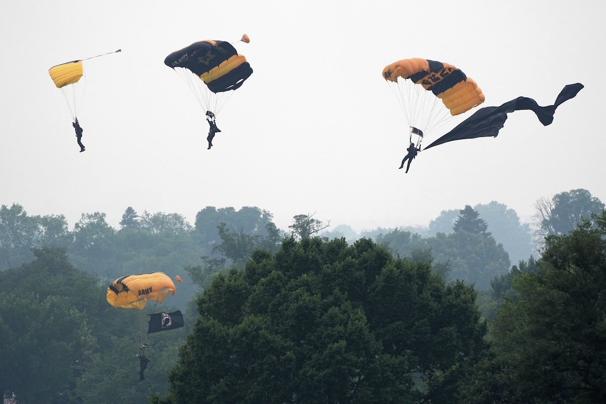 Up above, the Army’s Golden Knights parachute team appeared in the overcast sky, descending toward the reviewing stand. The team had been scheduled to jump at the end of the parade, but appeared in the skies above the National Mall far earlier than planned as a light rain fell.