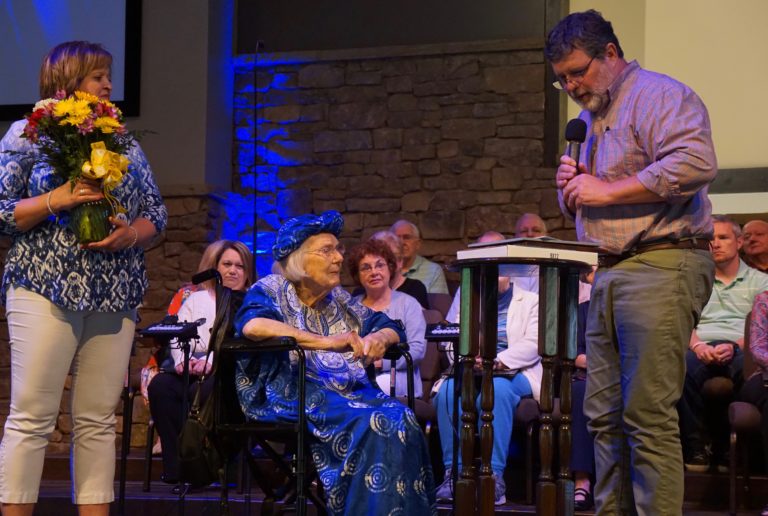 Ivey then made the third presentation on behalf of the Bethlehem Baptist Church, Anita’s home church. Ivey cited Anita’s work through the church and in the community and presented her with a monetary gift to use in any way she wanted. Cindy Hogsed, a church member serving on the missions committee and long-time friend of Anita’s, presented Anita with a floral bouquet. Cindy talked about how Anita had influenced her own life when she was a child studying Southern Baptist missionaries. At the end of the presentations, the entire congregation responded with a standing ovation.