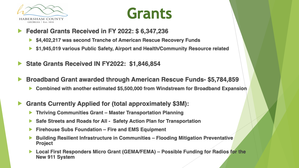 The county received over $13 million in various grants in FY 2022. For FY 2023, the county has applied for approximately $3 million in grants. Vaughn explained that one reason the county doesn’t receive as many grants is that the county doesn’t have plans in place. In order to receive the grant, the county must already have a plan in place and the county is working on that now.