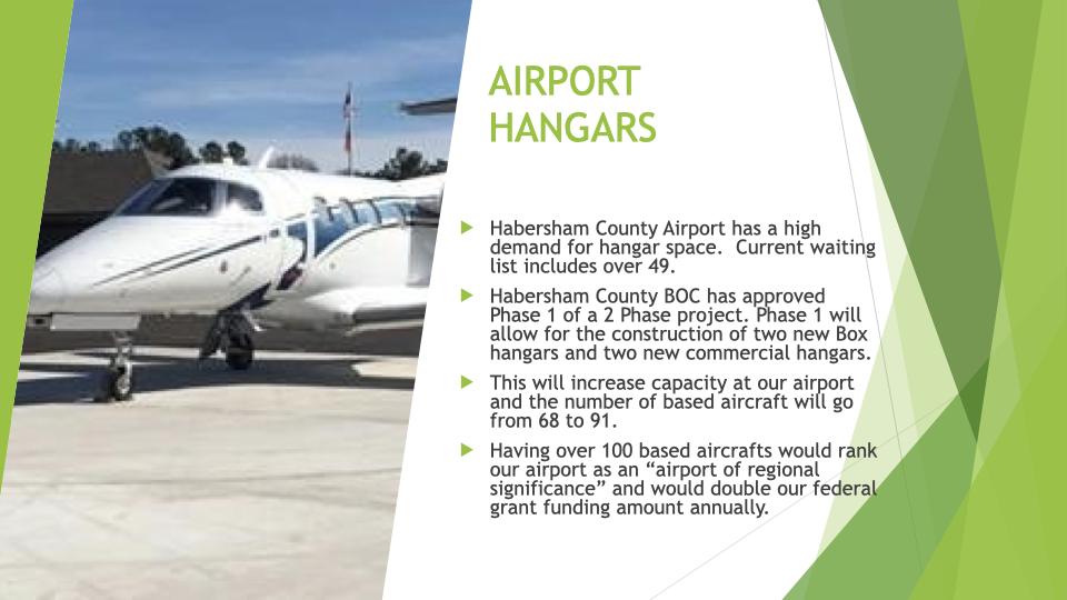 Harkness and Vaughn addressed current capital projects. The airport has a waiting list with 49 people waiting to rent hangar space. With demand at this level, the county commission has moved forward with Phase 1 of the hangar expansion project that will take its current capacity from 68 fixed base aircraft to 91. Once the airport has over 100 fixed base aircraft, it will become an airport of regional significance. This designation will double the amount of federal grant funding the airport will receive.