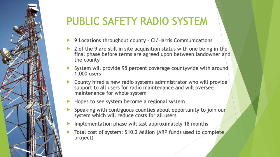 The county is still working on replacing the current radio system and is still in negotiations with property owners for two of the nine sites needed to provide 95% coverage throughout the county. The county has hired a Radio Systems Administrator that will provide support for all users with radio maintenance and upgrades and will oversee the maintenance of the whole system. The goal of the county is to become a regional radio system where more users will sign on and reduce the overall cost to all users. Once the project begins, it will take approximately 18 months to implement. The cost will be approximately $10.2 million and ARP (American Rescue Plan) funds will be used to complete the project.