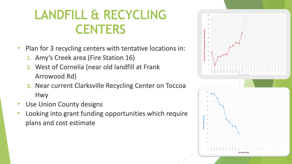 Habersham County is currently looking at installing three new recycling centers in the county with tentative locations in the Amy’s Creek area, West Cornelia, and Toccoa Highway near the Clarkesville Recycling Center. The county will use the designs that Union County is currently using. The county is looking into grant opportunities, but they will require plans and projected costs.