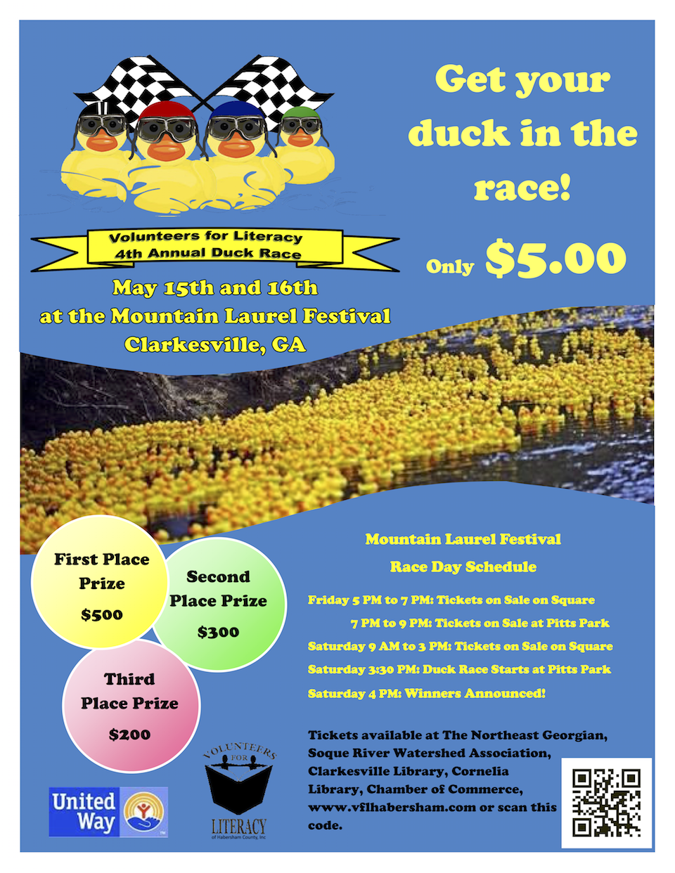 You can enter the race by adopting a duck for just $5! Tickets will be sold Friday, May 15th at the Volunteers for Literacy booth on the square near the Clarkesville gazebo. Just look for the big yellow duck!