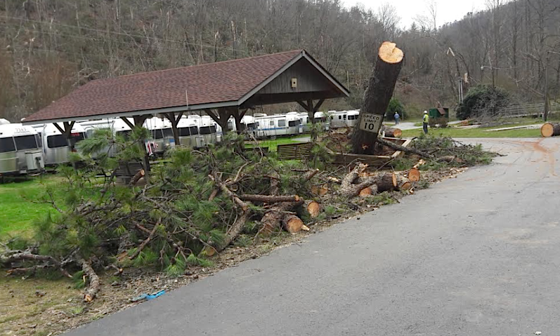 The high winds associated with the system downed numerous trees and power lines in and around the Top Of Georgia Airstream Park on Highway 75, north of Helen. The storm uprooted trees and caused additional power outages in the Orchard community and Bear Gap area in Habersham County.