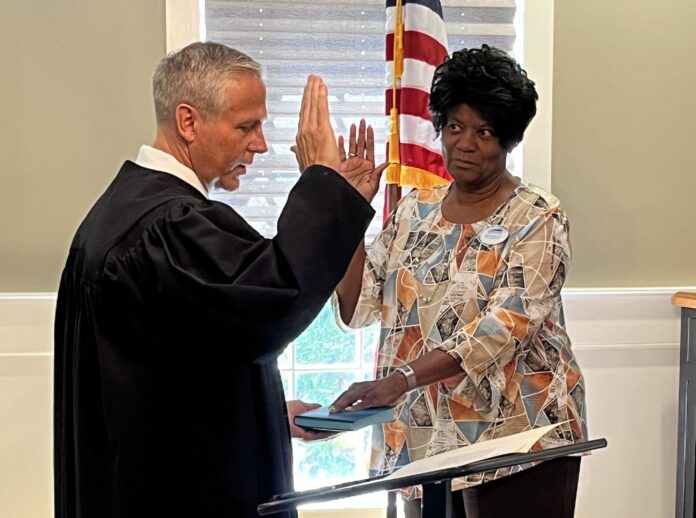 Mae Brown-Orr is the newest member of North Georgia Technical College's Board of Directors. Judge Chan Caudell administers the oath of office. (Amy Hulsey/NGTC)