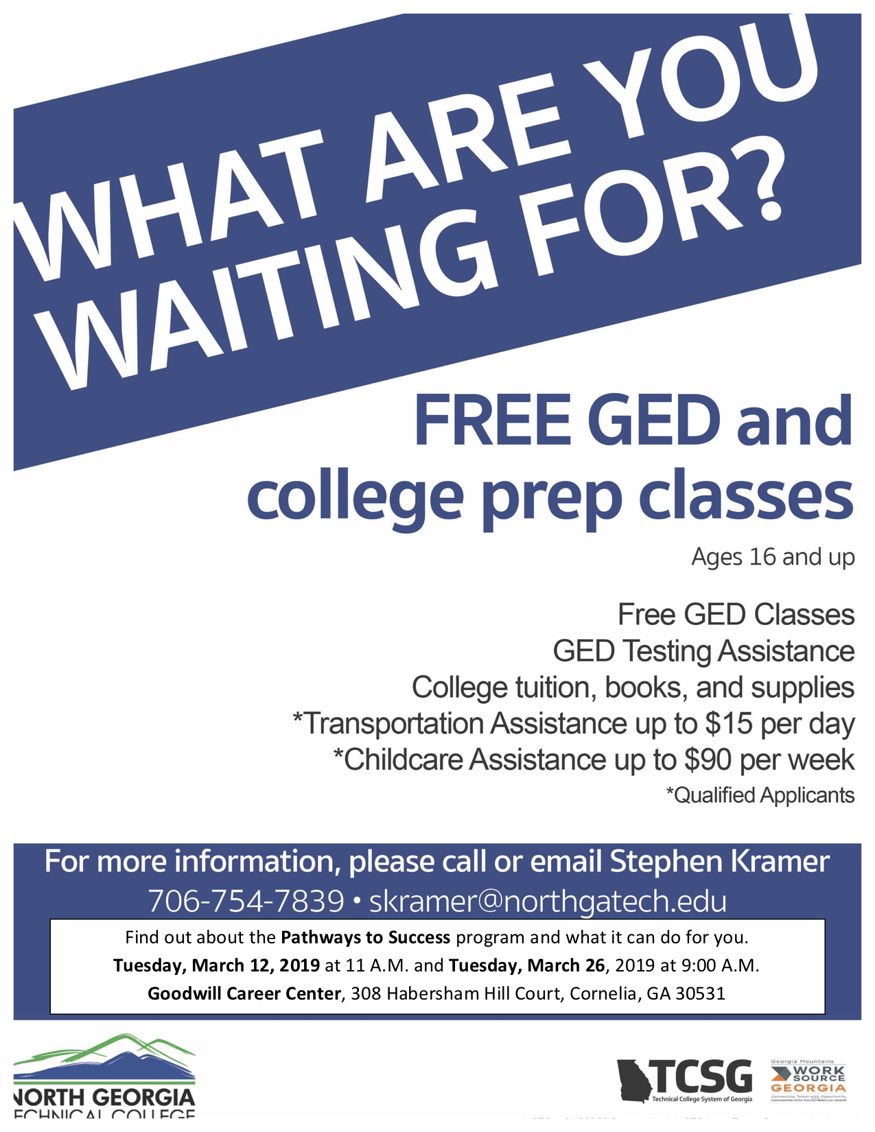 North Georgia Technical College is offering Pathways to Success for eligible young adults. Pathways to Success is a program that offers financial assistance to help qualified out of school youth, ages 16-24, obtain a GED, go to college, and get a job.