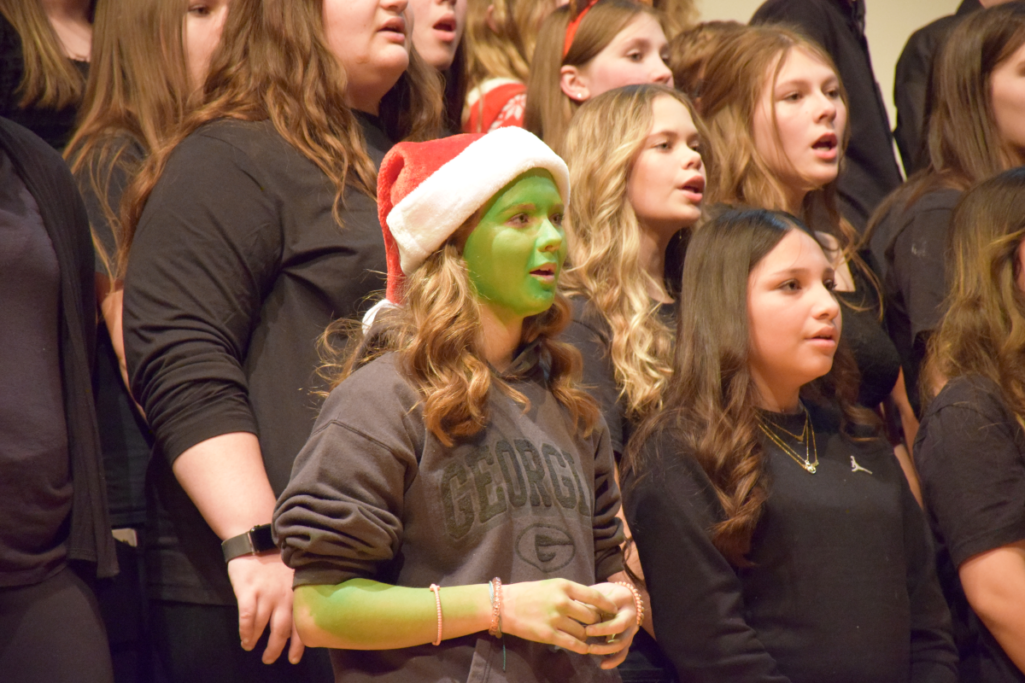 The evening concluded with a festive twist as the chorus students performed the playful “You’re a Mean One, Mr. Grinch,” featuring seventh-grade student Jaysee Chambers as the Grinch. Soloists Noah Barron and Jaycee McCollum added their voices to the whimsical holiday favorite.