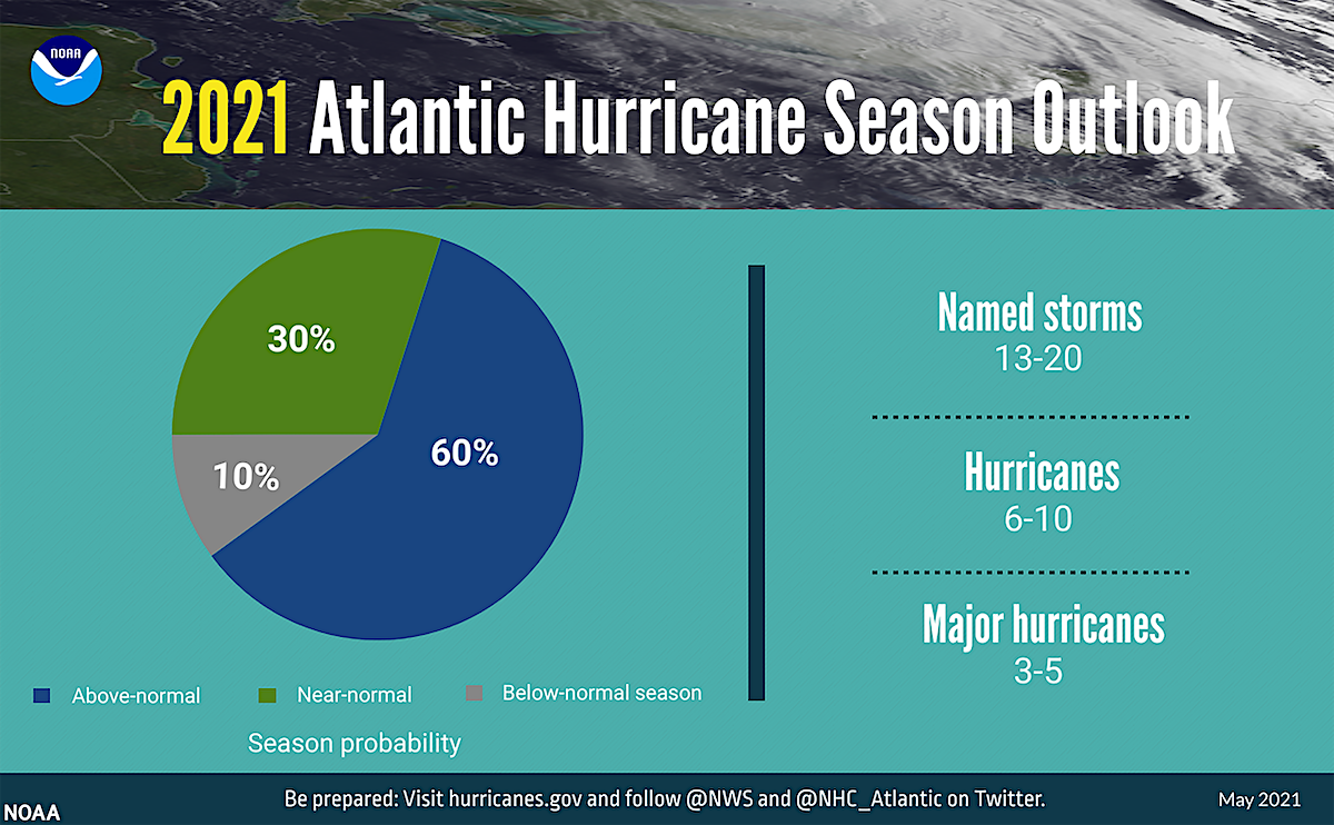 For 2021, NOAA predicts with 70% confidence a likely range of 13 to 20 named storms (winds of 39 mph or higher), of which 6 to 10 could become hurricanes (winds of 74 mph or higher), including 3 to 5 major hurricanes (category 3, 4 or 5; with winds of 111 mph or higher).