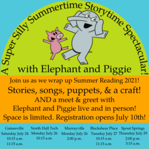 Monday the 26, join the Hall County Library System for the grand finale of their summer reading program, the Super Silly Storytime Spectacular with Elephant and Piggie. The spectacular will feature a story, crafts, music, puppets and an in-person meet and greet with Elephant and Piggie. The event will take place on both Monday, Tuesday and Thursday at several libraries throughout the county, so check out their website for more information on showtimes, locations and reservations.