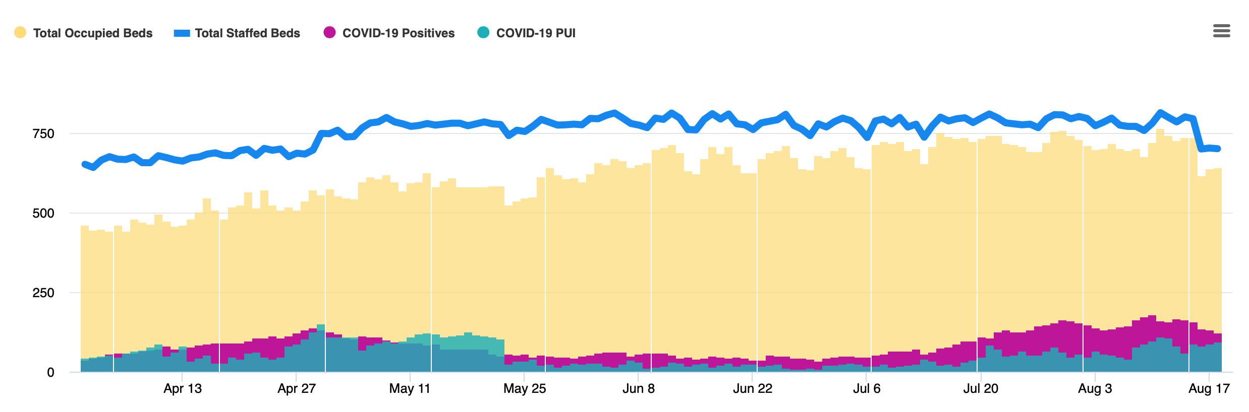 The chart shows Northeast Georgia Health System hospitals have been very close to running out of beds since mid-July when COVID volumes increased sharply. Dr. John Delzell, one of NGHS’ COVID-19 Incident Commanders who has a background in public health says it seems very likely that relaxed social distancing and large gatherings around the 4th of July weekend drove the increase in cases. “We should all keep that in mind as schools reopen and the Labor Day weekend approaches. We all need to make responsible decisions for our community’s health,” he says.