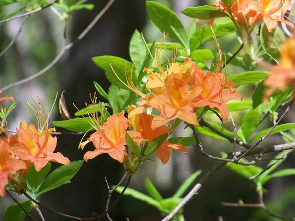 In mid-April each year, many people think the forests are on fire when they look off into the woods! In the right light, it almost appears to be a huge column of flame. Upon closer inspection, they discover the intensely orange Flame Azalea.