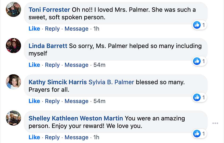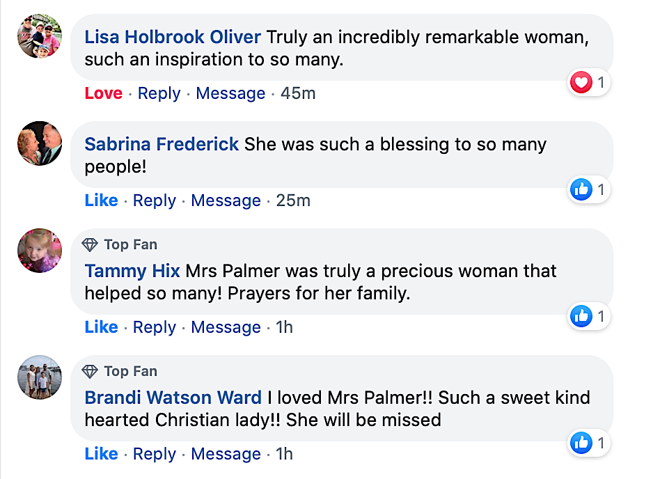 “She was a great example for many young people in Habersham County. Thankful for her impact and influence,” writes Martha Reabold. “Truly an incredibly remarkable woman, such an inspiration to so many,” adds Lisa Oliver. Brand Ward writes, “I loved Mrs. Palmer!! Such a sweet kind hearted Christian lady!! She will be missed.”