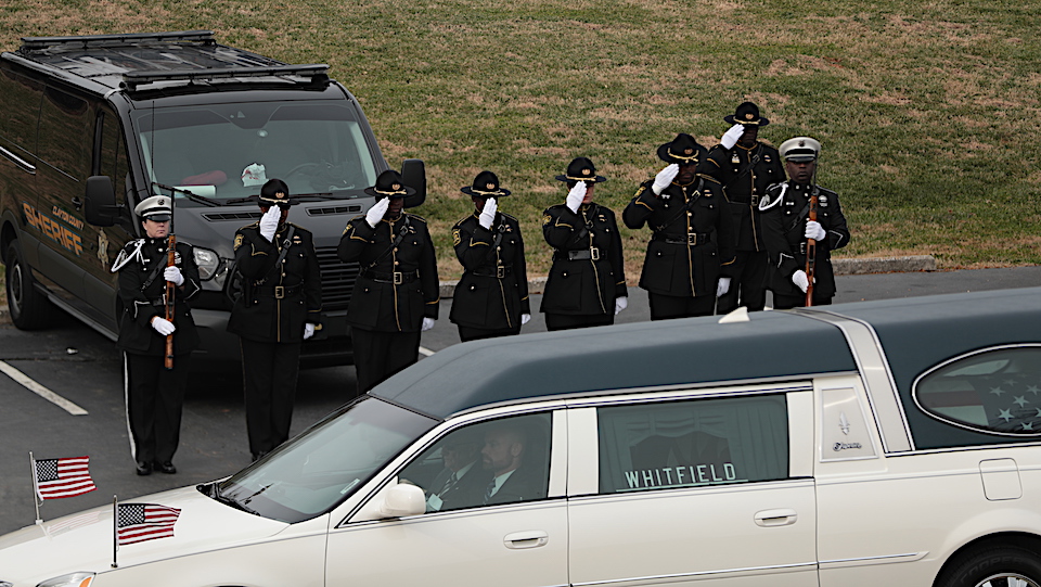 Law enforcement officers salute as Officer Edgar Flores’ body is escorted into Yonah Memorial Gardens in Demorest for burial. (Daniel Purcell/Now Habersham)