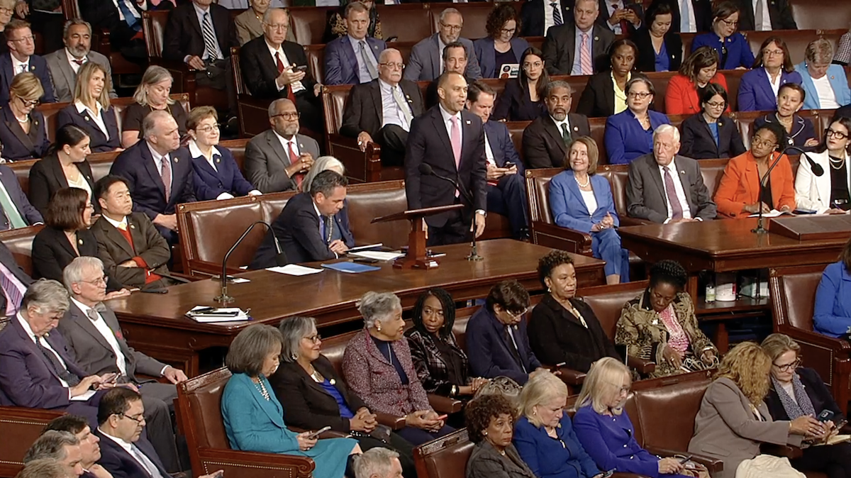 House Democratic Caucus Chair Pete Aguilar of California nominated New York Rep. Hakeem Jeffries for speaker, saying he was the clear candidate for anyone who wanted a bipartisan path ahead.