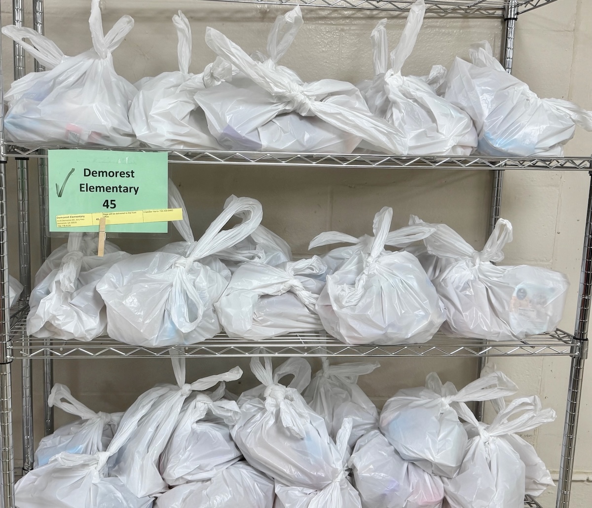 Each Thursday, volunteers pack bags filled with single-serve food items that students can take home. The food is distributed through the schools to children identified by counselors as needing supplemental meals.