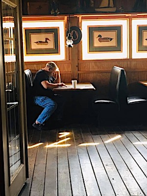 Ribeyes owner Jacob Young sits alone on an otherwise crowded Saturday night.