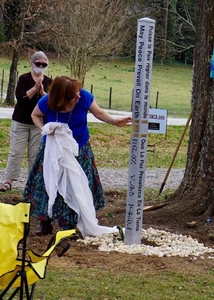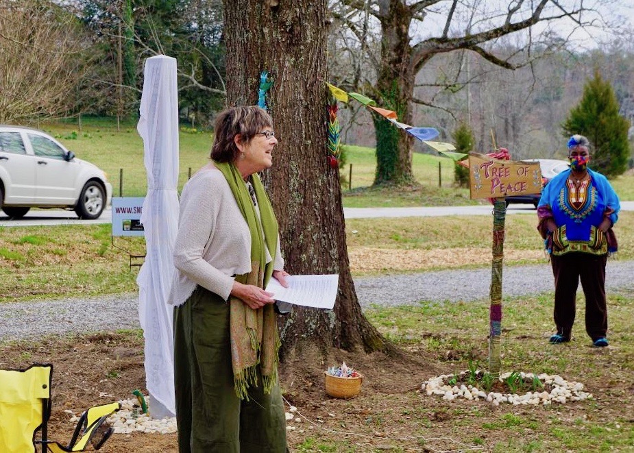 The new peace pole is inscribed with the words “May Peace Prevail on Earth” written in English, Cherokee, Japanese, French, Russian, Chinese, Spanish and Sanskrit, and is sponsored by the Sautee Nacoochee Cultural Center and Nuclear Watch South. The peace pole honors both Joan and the Nuclear Ban Treaty. Glenn Carroll, the coordinator of Nuclear Watch South, was a part of the ceremony as well.