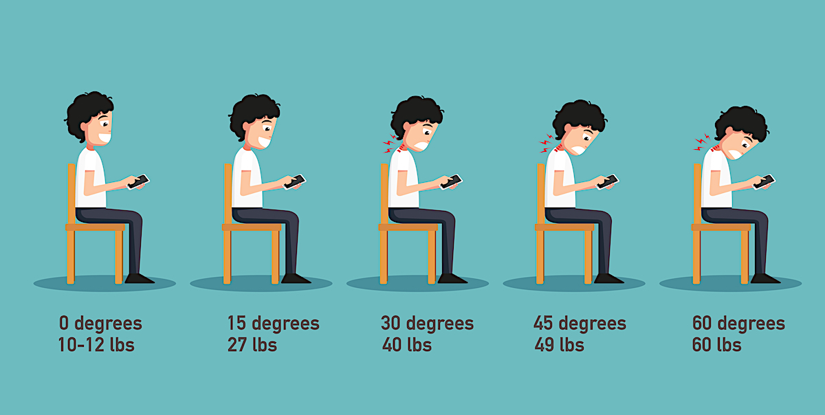 It shows the increasing weight that the neck bears as it bends downward and forward. The more hunched over you are, the greater the burden.