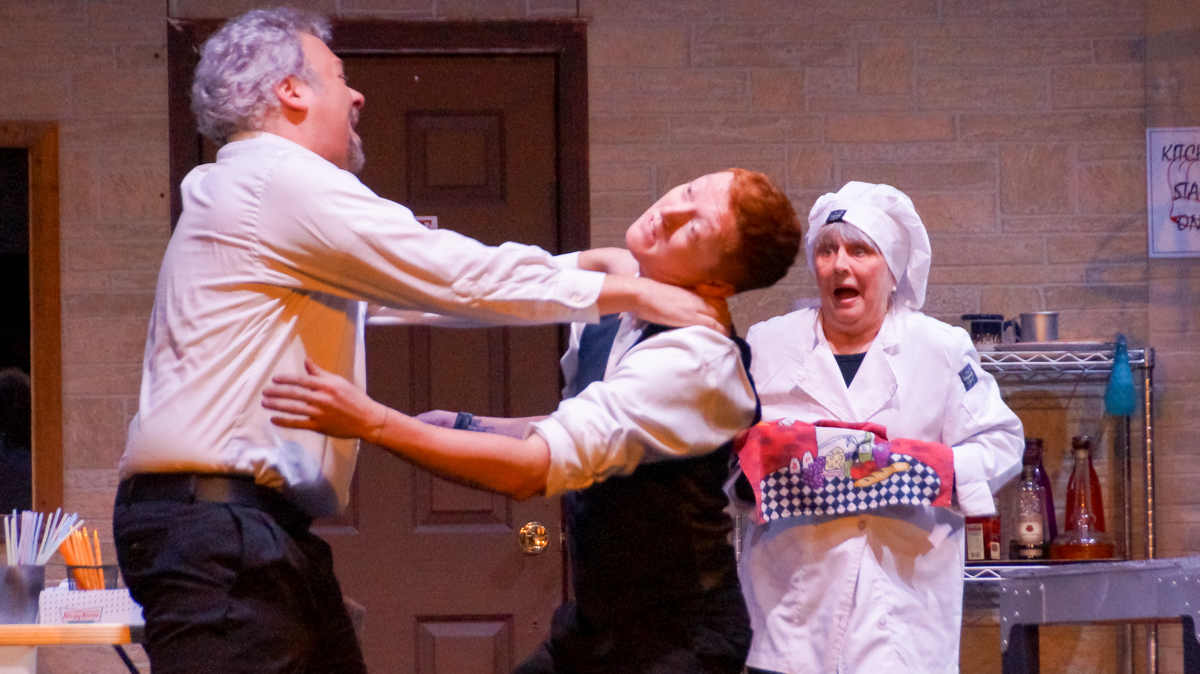 This production is different in that it has a limited cast – ten, including female understudy Jubilee Chastain – and a single set; it takes place entirely in the restaurant kitchen and requires five doors for slamming.