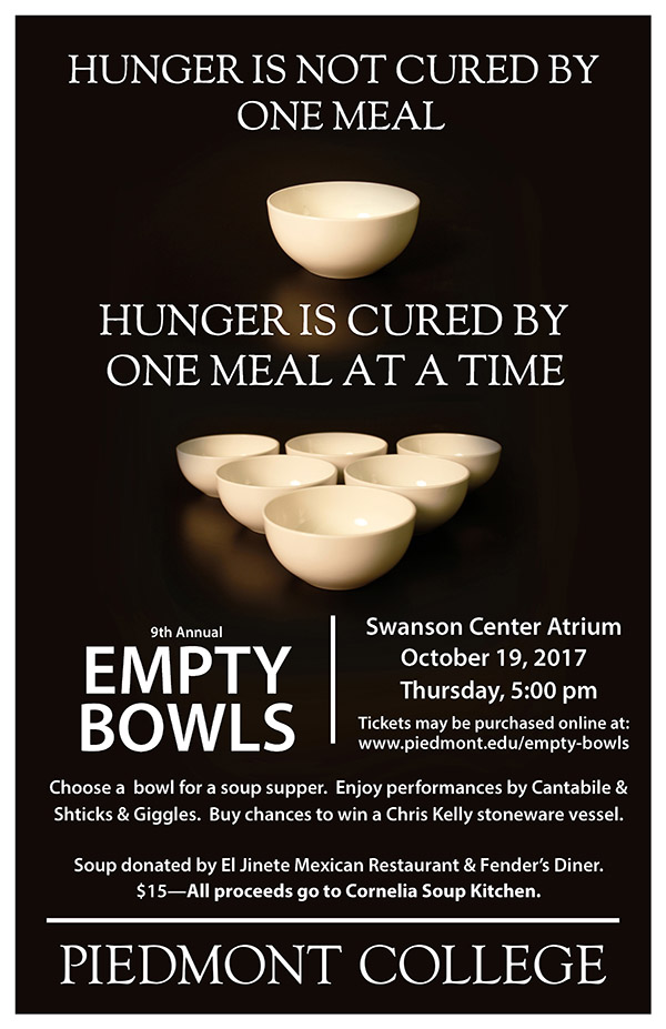 At 5 p.m., Thursday, Oct. 19, 2017, in the Piedmont College Swanson Center, students will be serving soup and bread in hand-crafted bowls. For a $15 donation, participants can pick out a bowl to keep and enjoy a simple supper donated by El Jinete Mexican Restaurant and Fender’s Diner.