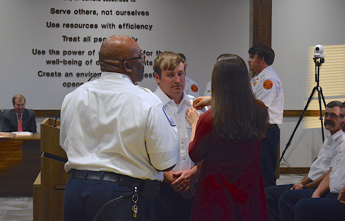 The Cornelia City Commission hosted a firefighter pinning ceremony at its March 7 meeting, during which six firefighters were recognized for their recent promotions. More than 50 people attended, including fire department staff, family, friends, and community members.