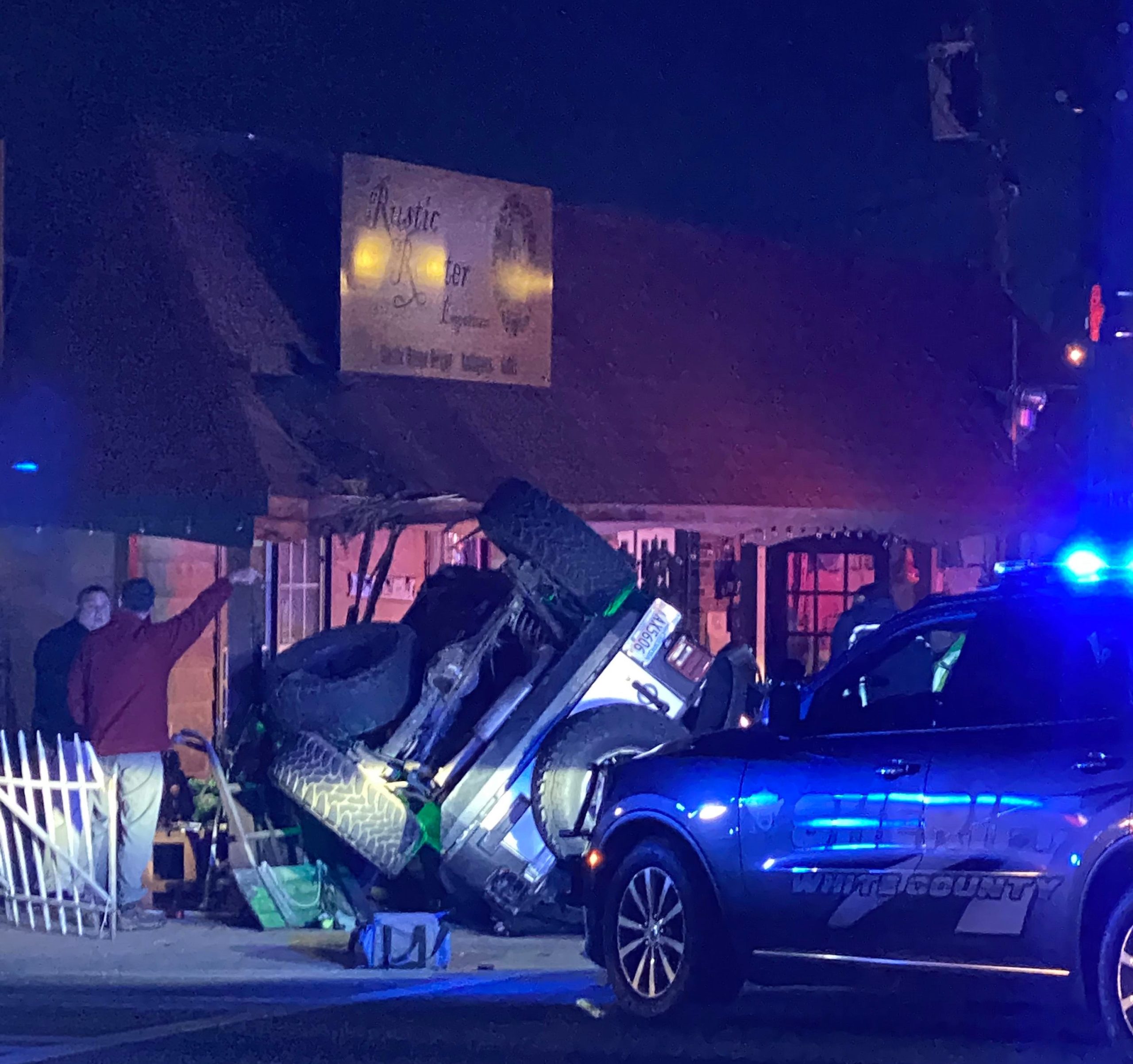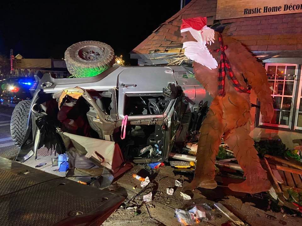 After impact, the Jeep overturned, struck a DOT crosswalk sign and The Rustic Rooster Shop.