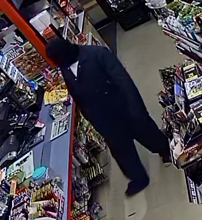 The image shows a person in an all-black jumpsuit, wearing a black ski mask and black socks. Police say he was brandishing a gun.