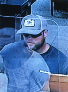 Surveillance cameras captured an image of the suspect which investigators publicly circulated to help identify him. The image shows a white male with a medium to stocky build, brown hair, and a beard. He was wearing a gray t-shirt, jeans, ball cap, and sunglasses at the time of the robbery.
