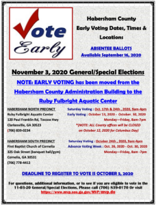 Early voting in Habersham will take place from 8 a.m. to 7 p.m. weekdays Oct. 13-30 at the Habersham North Precinct located at the Ruby Fulbright Aquatic Center in Clarkesville. Saturday voting will be held at that same location from 9 a.m. to 4 p.m. on October 17 and 24.