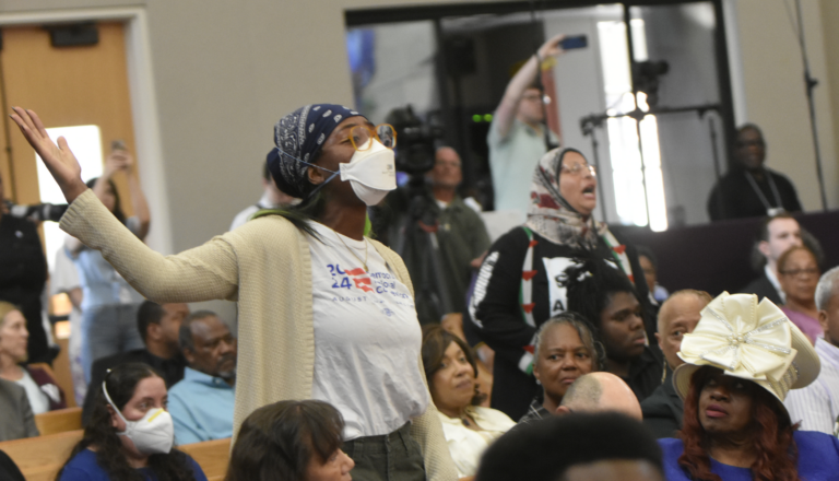 Protesters call for an end to arm sales to Israel at a town hall for Sen. Raphael Warnock. (Ross Williams/Georgia Recorder)