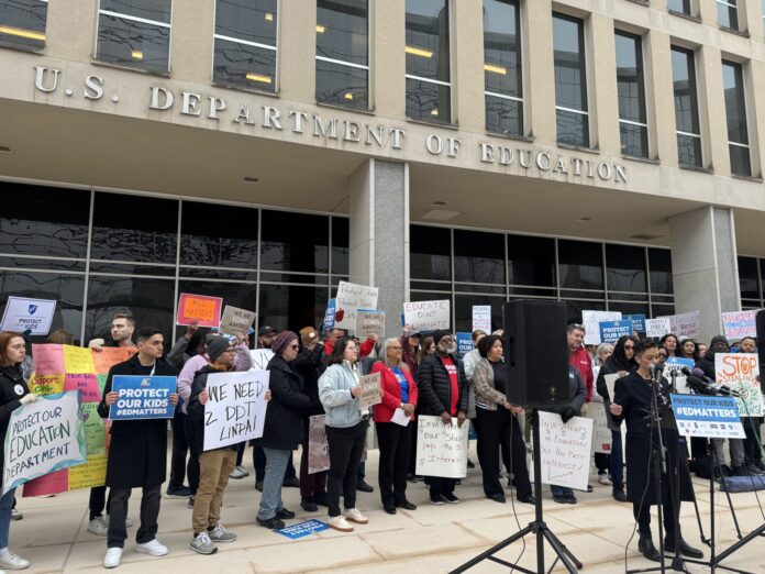 WASHINGTON (States Newsroom) — Dozens gathered Friday outside the U.S. Department of Education to protest the ousting of more than 1,300 employees and President Donald Trump’s plans to dismantle the agency.