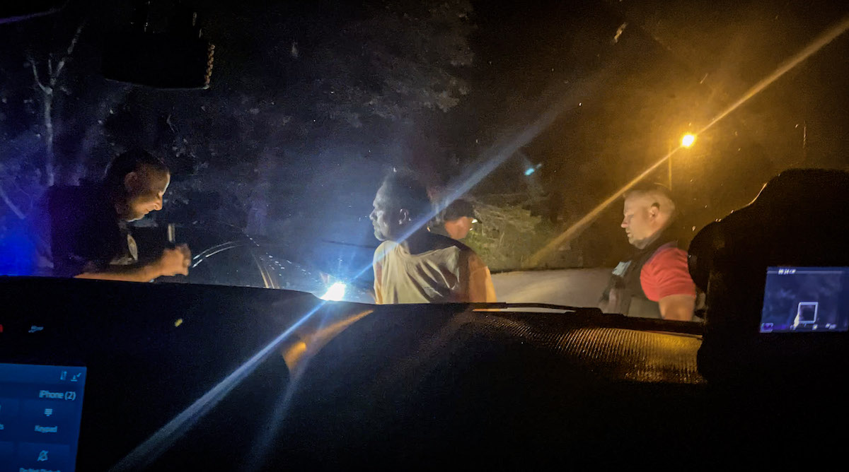 Assistant Demorest Police Chief Casey Chastain takes Charles Hunter into custody shortly before 1 a.m. on Tuesday, April 26, in Clarkesville. (Red Bird Media)