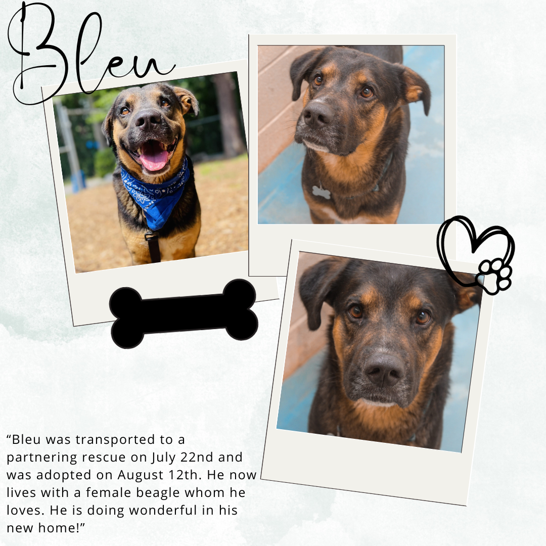 Bleu. Bleu was surrendered for adoption in May and spent 67 days in the shelter looking for his second chance. He was transported to a partnering rescue facility in July and was officially adopted on August 12th.