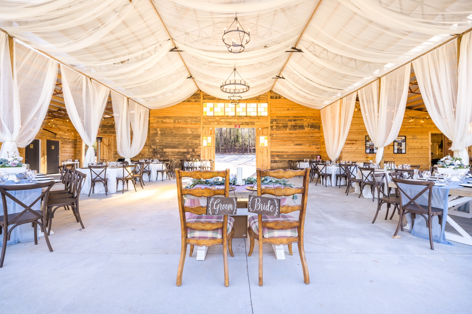 Then came the stained glass. Brittany salvaged antique windows from a church in Atlanta. Now set into the barn’s apse, they transform sunlight into painterly hues—emerald, amber, and dandelion yellow. “Light was part of the vision,” she explains. “We didn’t want pretty for pretty’s sake. We wanted something that made people feel part of a larger story.”