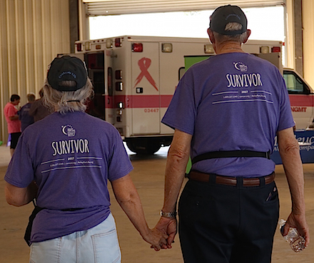 Diane and Charles Black join fellow cancer survivors in a celebration lap during the annual Habersham County Relay for Life. (photo/Daniel Purcell)