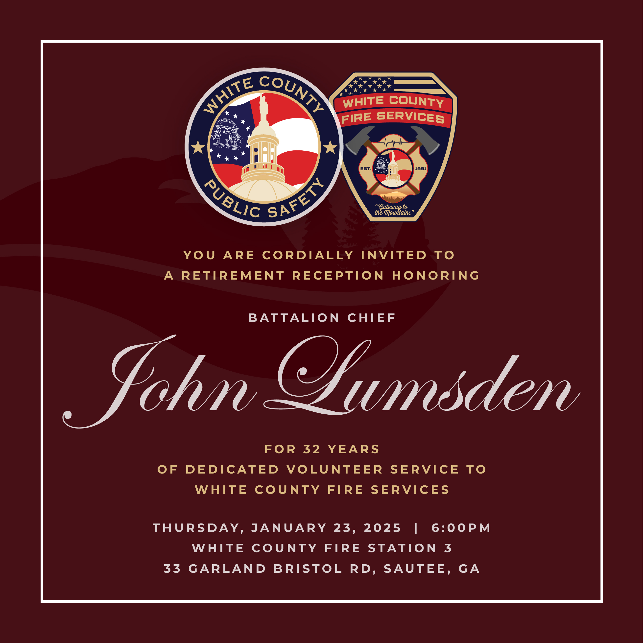 SAUTEE, Ga. — A retirement reception will be held on Thursday, January 23, to honor the 32 years of dedicated volunteer service of Battalion Chief John Lumsden to White County Fire Services.