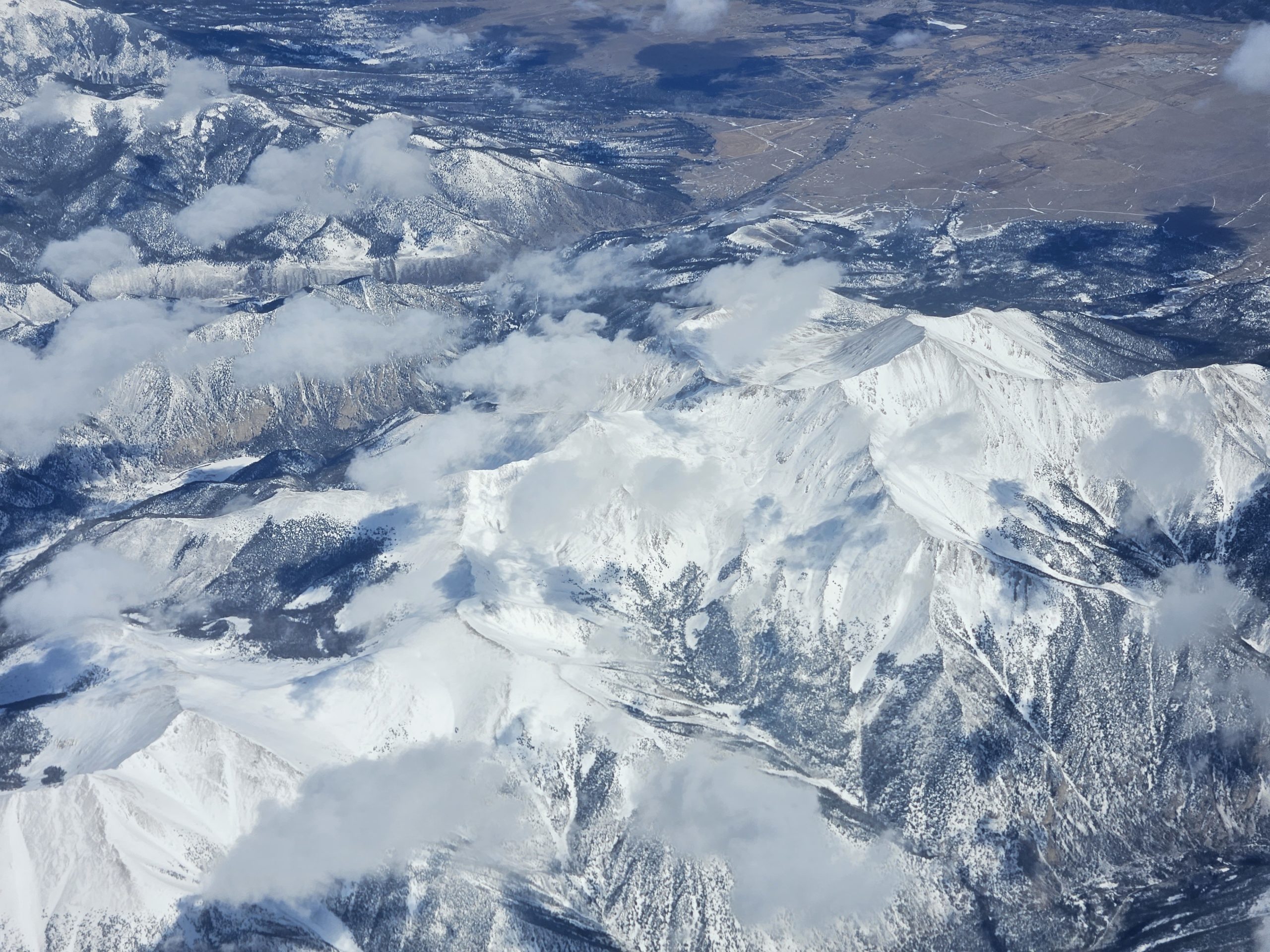 From the sky, I got my first view of the Rocky Mountains. Unfortunately, it was quite cloudy over much of the mountain range, thanks to a large ongoing snowstorm, but we did catch some views of the eastern range through the clouds.