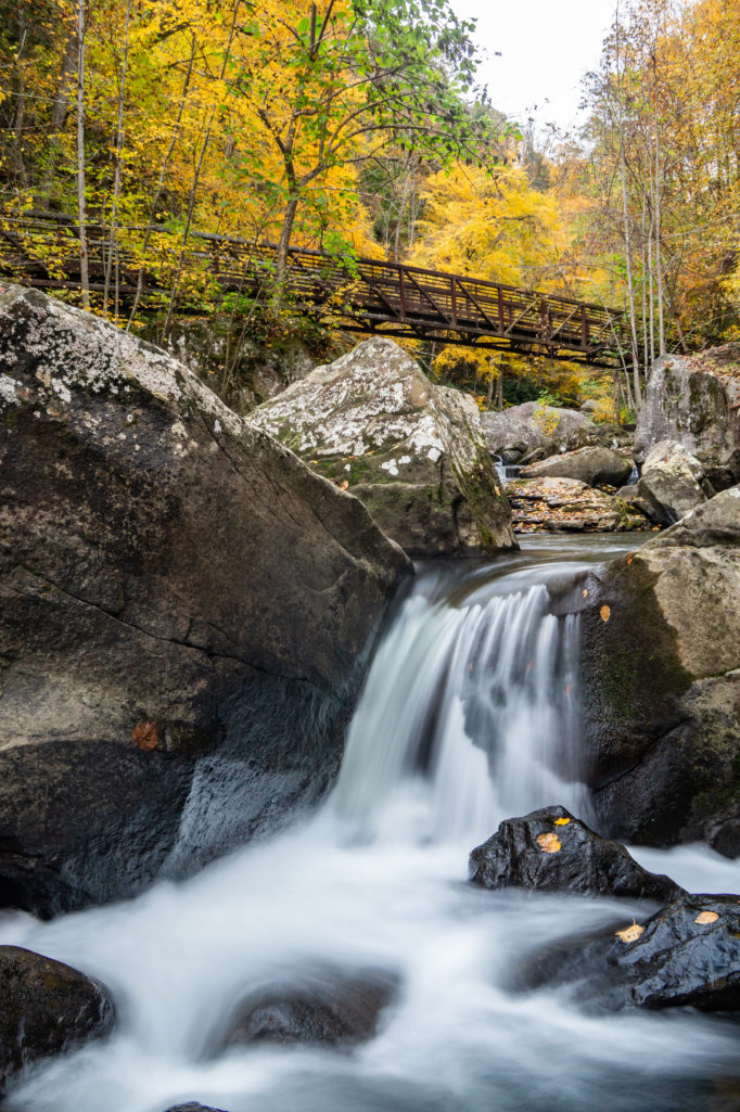 Located on the other side of the gorge very close to the bridge is Wolf Creek. Wolf Creek is home to a series of cascades and waterfalls. The largest waterfall, the aptly named Wolf Creek Falls, is very difficult to access down a VERY steep drop with limited handholds and a lot of slip-sliding. Much easier to access are the cascades near the footbridge at the bottom of the Kaymoore connector trail. I was fortunate to catch colors at peak here, which was nice with limited room for parking.